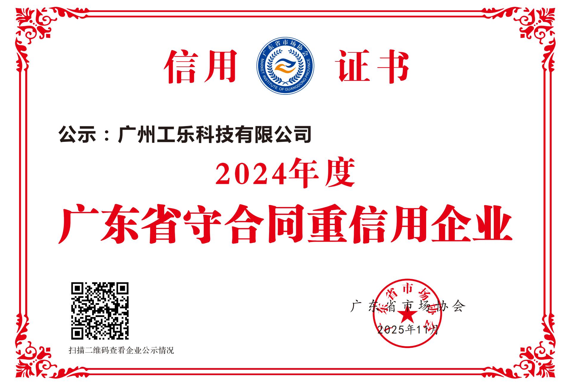 荣获"守合同重信用企业"证书我们荣幸地宣布,广州工乐科技有限公司荣获由广州市市场协会颁发的"2024年度广东省守合同重信用企业"证书。这份沉甸甸的荣誉,是对工乐科技始终恪守商业信誉、坚持契约精神的最佳褒奖。