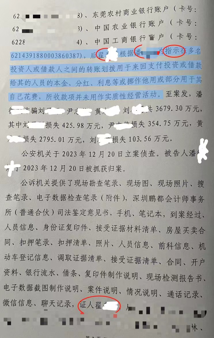 而在判决书中,东莞市第一市区检察院指控潘某某(已于2025年2月12日被东莞市第一人民法院判刑13年)自2021年7月份开始,虚构有收废铁、沙土回填等经营性项目,许诺每天按投资金额高达1%作为红利,采用“拆东墙补西墙”的方式逐步骗取刘某、尹某、黄某、等人向其投资借款。上述被害人将投资钱款转到潘某某提供的其女朋友翟某某的广发银行账户(卡号6214省略);东莞农村商业银行账户(账号6230省略);中国农业银行账户(账号6228省略);中国工商银行账户(账号6214省略),后翟某某(原嫌疑人被刑拘后取保,在判决书中作为证人)根据潘某某的指示在多名投资人或借款人之间的转账划拨用于来回支付投资或借款给其的人员的本金、分红、利息等或挪做他用或部分用于其自己花费,所收款项并未用作实质性经营活动。