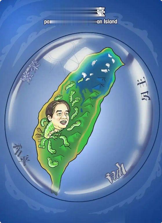 台湾岛的平面图就是一个蛋壳中的胚胎,绿色为主、蓝色为辅的台湾岛图形,也像是一片树叶,寓意着台湾岛上已经是追求“台独”的“绿营”占据主导。一个虫身人头的赖清德画像周边,是一群绿色的毒虫。一是寓意着赖清德就是“母虫”,繁殖了一群毒虫。二是寓意诸多的“台独”顽固分子,他们正在蚕食台湾岛那片绿色为主的树叶。