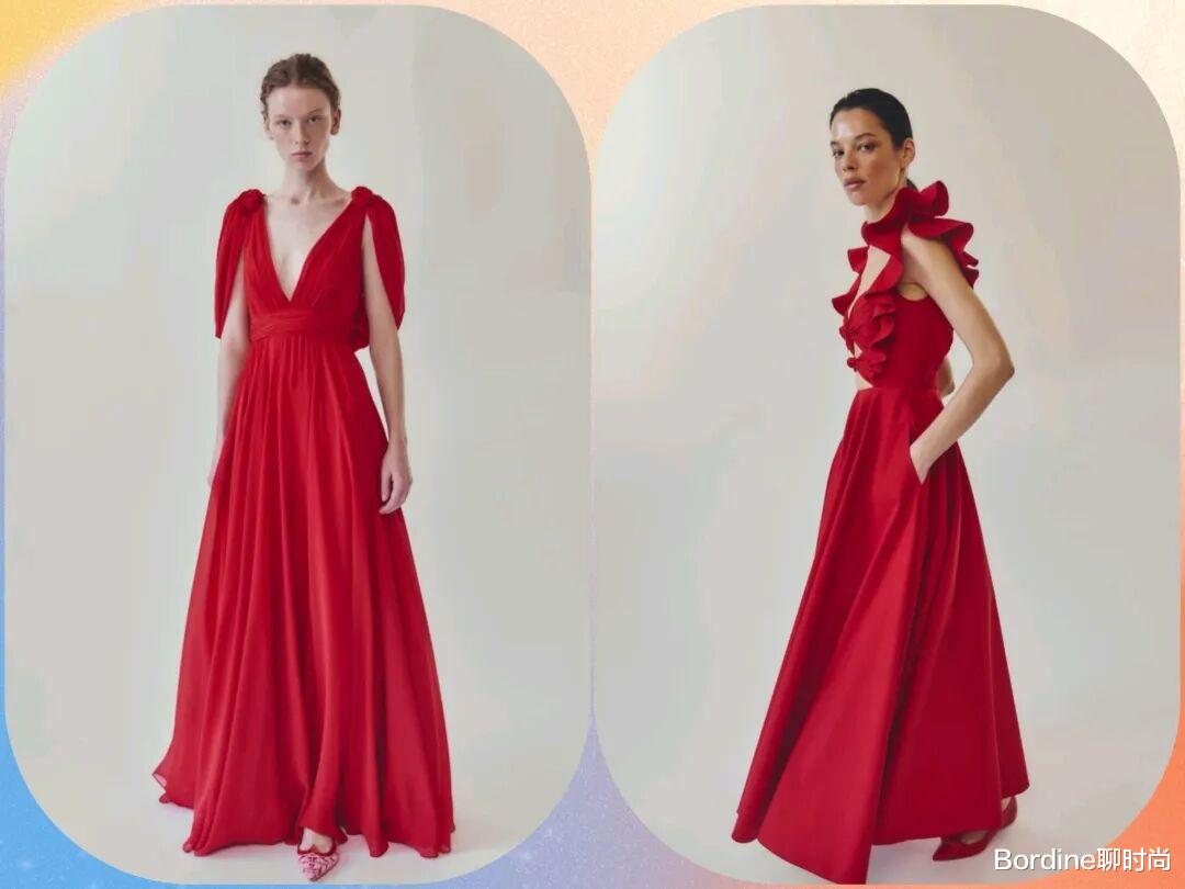这些红色的颜色也在修身廓形为主的连衣裙上,让张扬的色彩也多了不少温婉优雅的气质感,在裙装上更是以一字肩和挂脖的结合、斜肩的不对称等这些设计的结合,在露肩的设计中,将不少的视线集中在肩部,还有褶皱元素、开叉下摆、镂空等这些设计,为纯色的裙装也增加了更多的设计感。