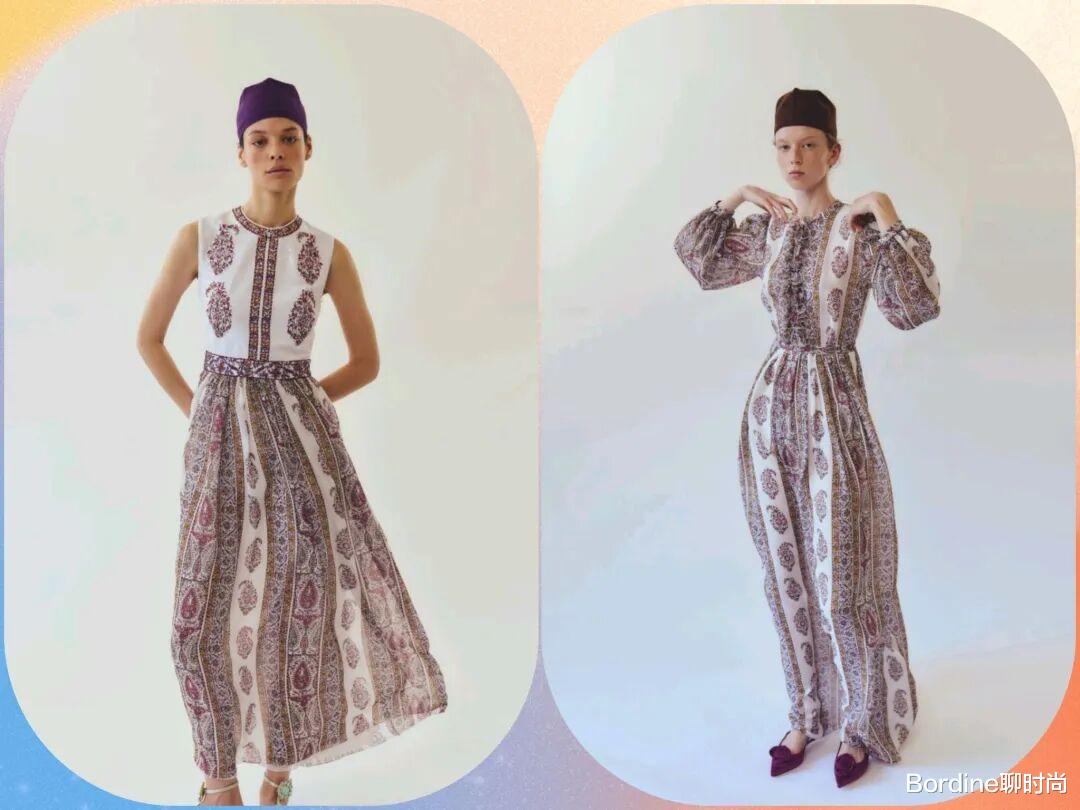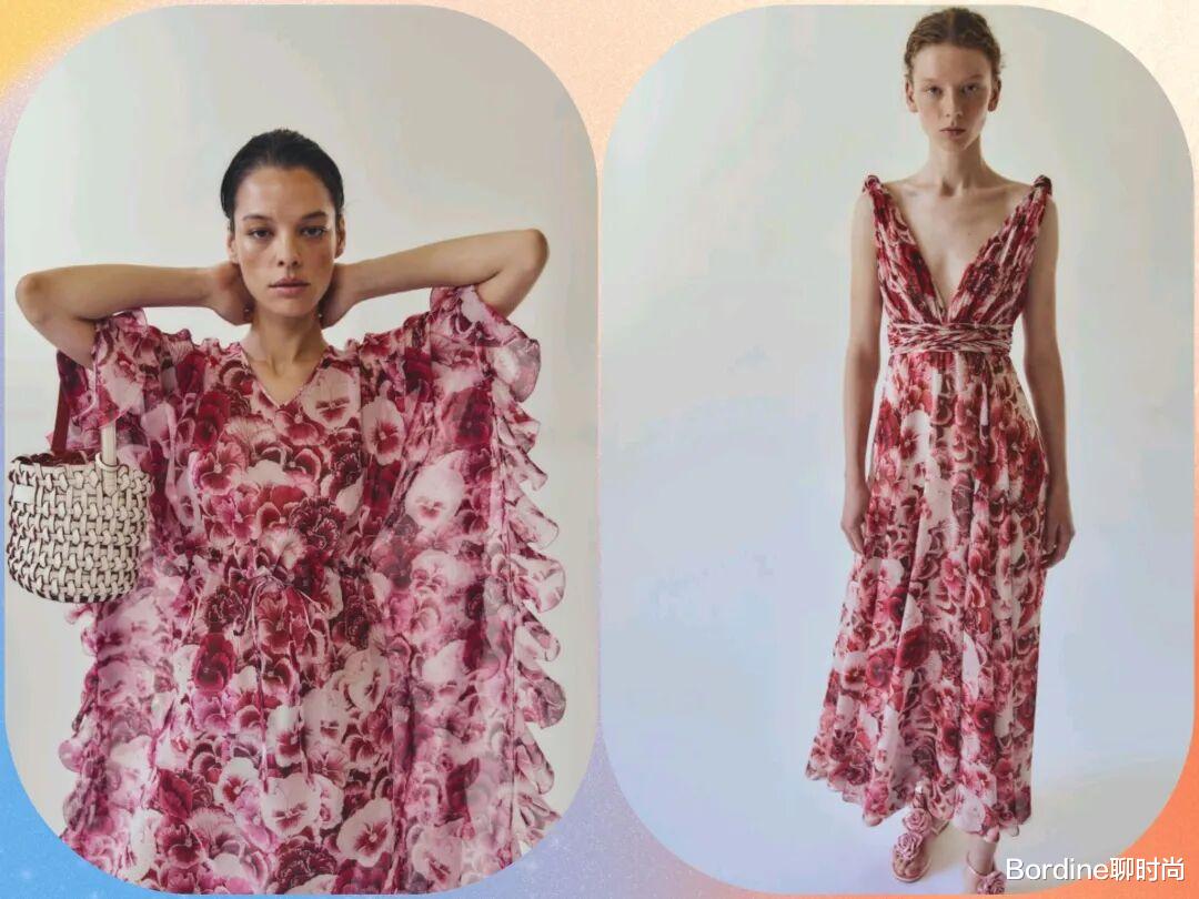 枝蔓的花纹图案在裙装的优雅中,轻薄的材质也在一些粉色颜色的装饰,浪漫活力也多了一些娇弱优雅。