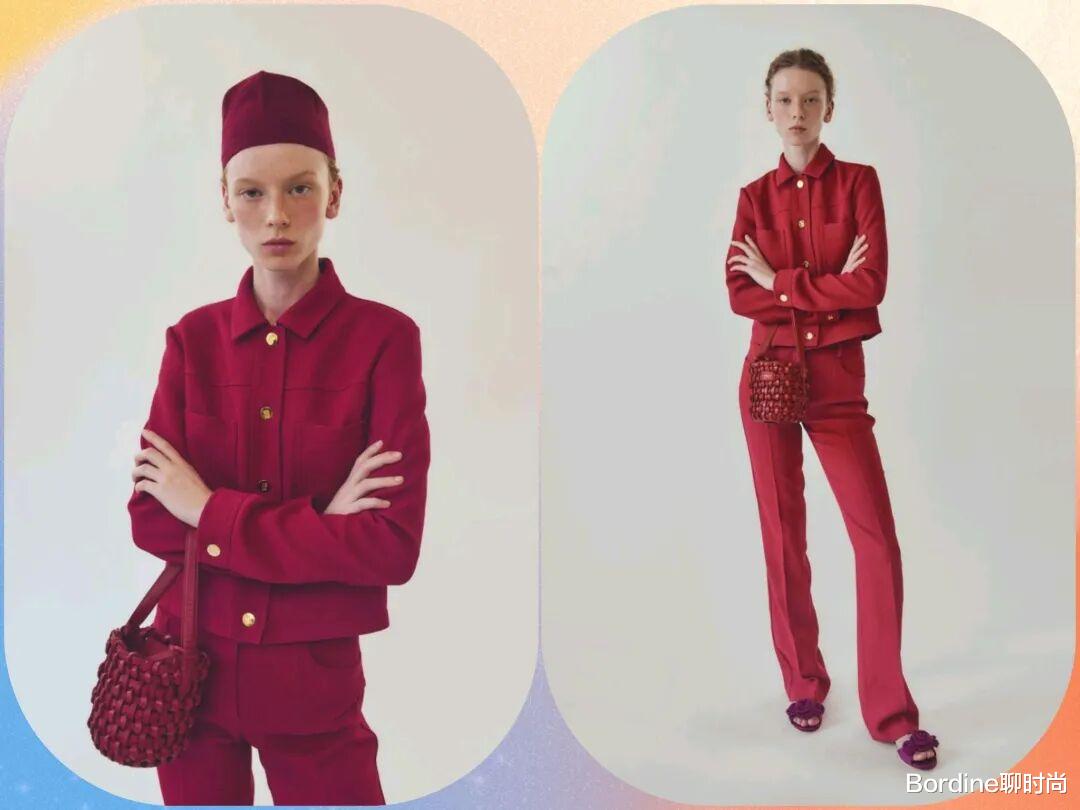 【教皇红】在教皇红色的颜色中,鲜艳的颜色在套装的穿搭上,传递了不少热情气质,在纯色的简约中,也营造了一些热烈的氛围感。套装的穿搭也在面料的材质纹理质感中,休闲的上衣也在和直筒裤的搭配增加了利落干练的气质,而金色的纽扣元素在装饰中,也有吸睛亮点的高级时尚。