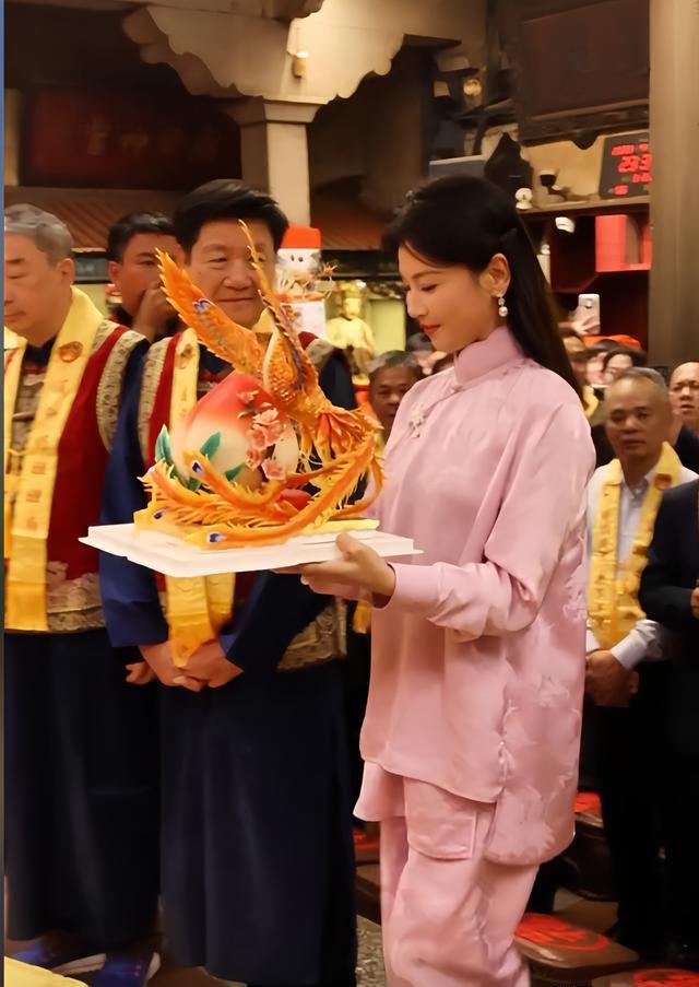 网友发出了现场视频,刘涛身穿淡粉色的中式套装,脸上画着淡妆,头发简简单单的别在耳后,手里端着进献给妈祖的寿桃,袅袅地从门外走进大殿。