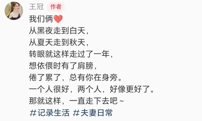 王冠这条社交动态的标签是夫妻日常,配图也是他们夫妻一起生活的日常碎片。