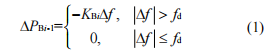 式中,ΔPBi-1为第i组储能单元虚拟下垂出力功率增量;KBi为该储能单元虚拟下垂出力系数;Δf为系统频率偏差;fd为调频死区。虚拟惯性控制模拟传统调频机组的惯性响应,依据系统频率变化率调节出力功率,从而增大系统惯量。储能单元以虚拟正惯性调频出力,函数表达式为:
