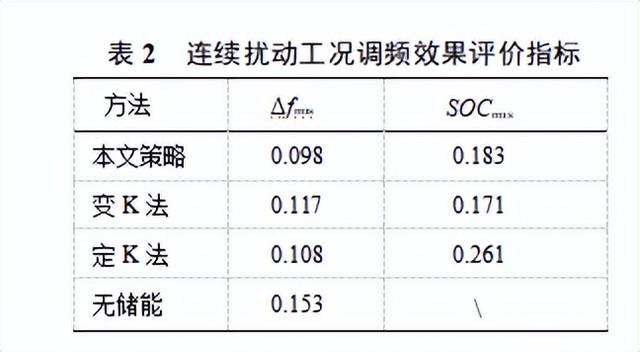 调频效果评价指标如表2所示。由表2评价指标可知,连续负荷扰动工况下,本文策略频率波动指标Δfrms在对比方法中最优,储能SOC维持效果指标SOCrms虽然略低于变K法,但相较于定K法有着明显的优势。综合上述,本文控制策略在应对系统连续负荷扰动时,在改善一次调频效果的同时,也提高了储能电站调频容量利用率,具有实际工程意义。