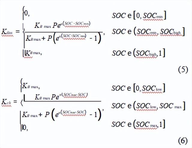 式中,Kdiss与Kch分别为储能单元放电与充电系数;KBmax为储能单元最大调节功率;P为储能单元额定出力功率;n为调节曲线变化趋势系数;本文将储能单元SOC设定成5个区间,最小值SOCmin、较小值SOClow、较大值SOChigh和最大值SOCmax,分别取值为0.15、0.45、0.55和0.9。