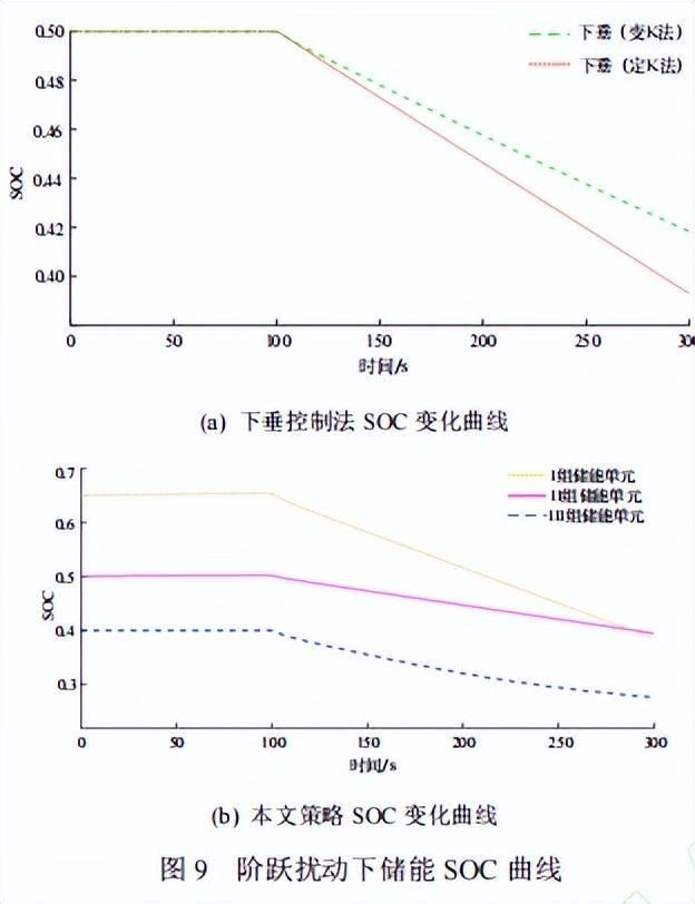 设定三组储能单元的起始SOC分别为0.4、0.5与0.65,对比策略储能初始SOC为0.5。其余参数标幺值计算均以机组额定容量与电网额定频率(50Hz)为基准值。为验证本文所提控制策略的优势性,采取两种不同的工况进行仿真。