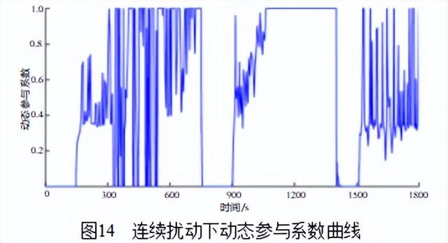 在整个连续负荷调频阶段,由图14可知,在1100s后由于此时各储能单元SOC处于较低值,为防止电池出现过放,牺牲部分调频功率,动态参与系数长期保持最大值。故在此阶段下,本文策略在保证电池使用寿命的基础上,又尽力保证调频效果不低于变K法。