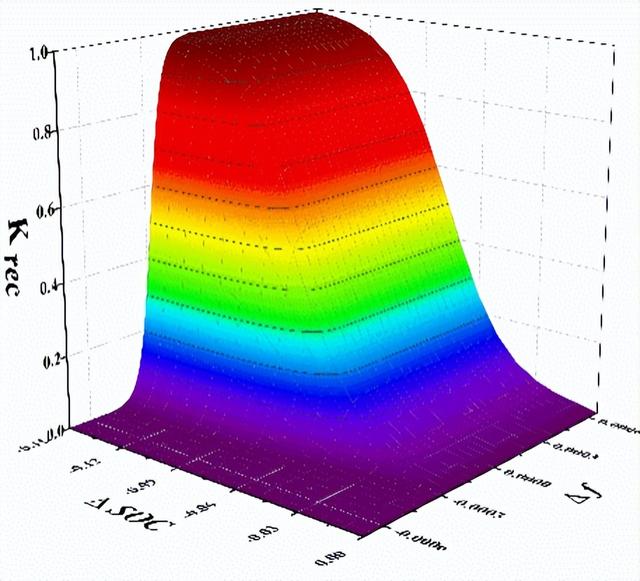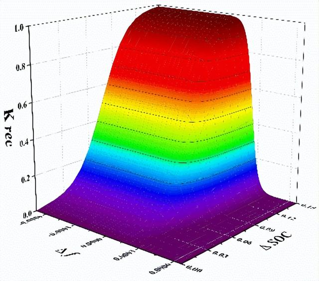 式中,PL为负荷预测值;Pd为负荷扰动死区;实际恢复系数Krec关于ΔSOC、Δf的曲线如图6所示。以充电恢复为例,在ΔSOC较小时,SOC恢复需求较大,若此时Δf>0,可以较大的实际恢复系数进行恢复。若此时Δf<0,为使频率不再次跃出死区,故以较小的实际恢复系数进行恢复。