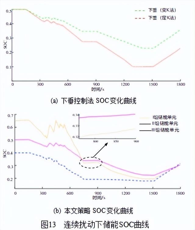 由图13a可知,对比策略在调频死区内,未对SOC进行恢复处理,未能充分利用储能调频容量。由图13b可知,当处于调频死区阶段时,在预测到下阶段初始调频阶段需要进行放电出力调频时,优先对I组与II组主力单元进行充电恢复,为下阶段放电出力调频做准备。