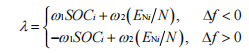 式中,λ为参与因子;SOCi为第i组储能单元荷电状态;ENi为第i组储能单元额定容量;N为储能电站额定总容量;ω1、ω2为比例系数。
