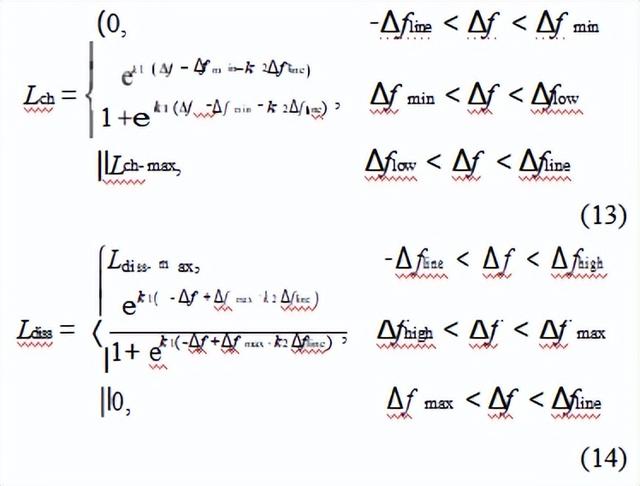 式中,k1、k2为控制函数调节系数;本文将频率偏差Δf划分5个区间,最小值Δfmin、较小值Δflow、较大值Δfhigh、最大值Δfmax与界限值Δfline。
