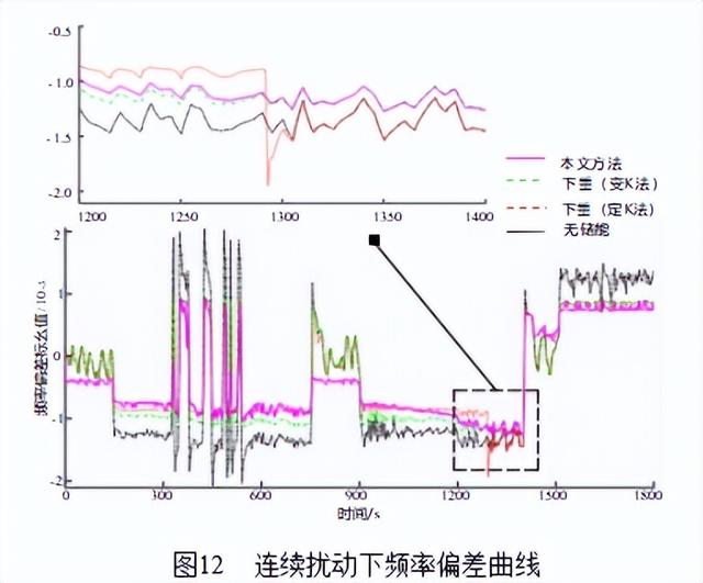 由图12可知,在系统处于连续负荷扰动工况时,在前1100s本文策略频率偏差明显优于无储能法、定K法与变K法,后随着储能SOC不断降低,此时为保护电池使用寿命,调频出力降低,故调频效果逐渐变弱,而定K法出力大小不受储能SOC大小限制,虽在短时间内调频效果优于其他方法,但在1300s附近时电池能量消耗殆尽,储能随即退出调频工作,故而导致调频出力功率骤降,使得系统频率产生巨大跌落。
