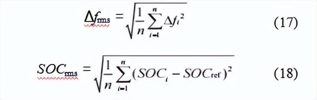 (2)对于连续负荷扰动工况,定义频率偏差均方根与SOC均方根为评价指标,如式(17)~(18)所示