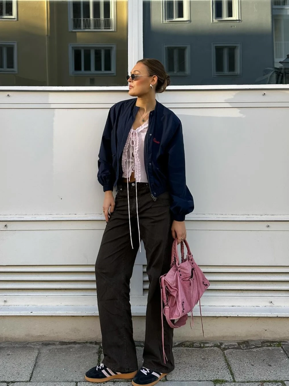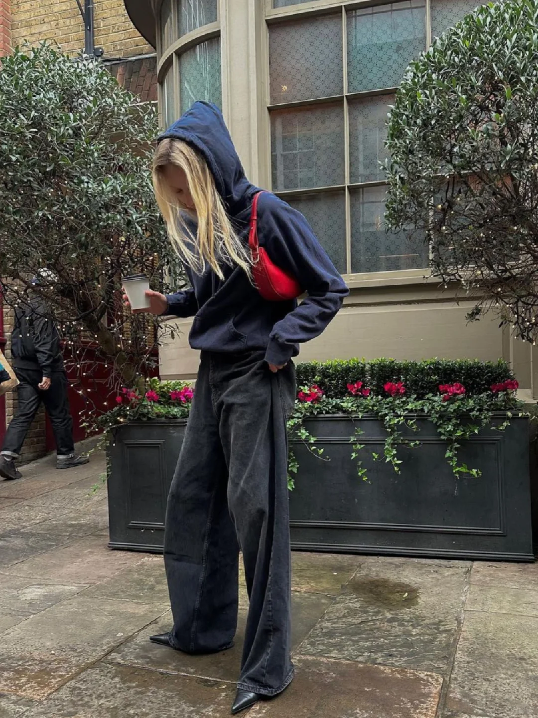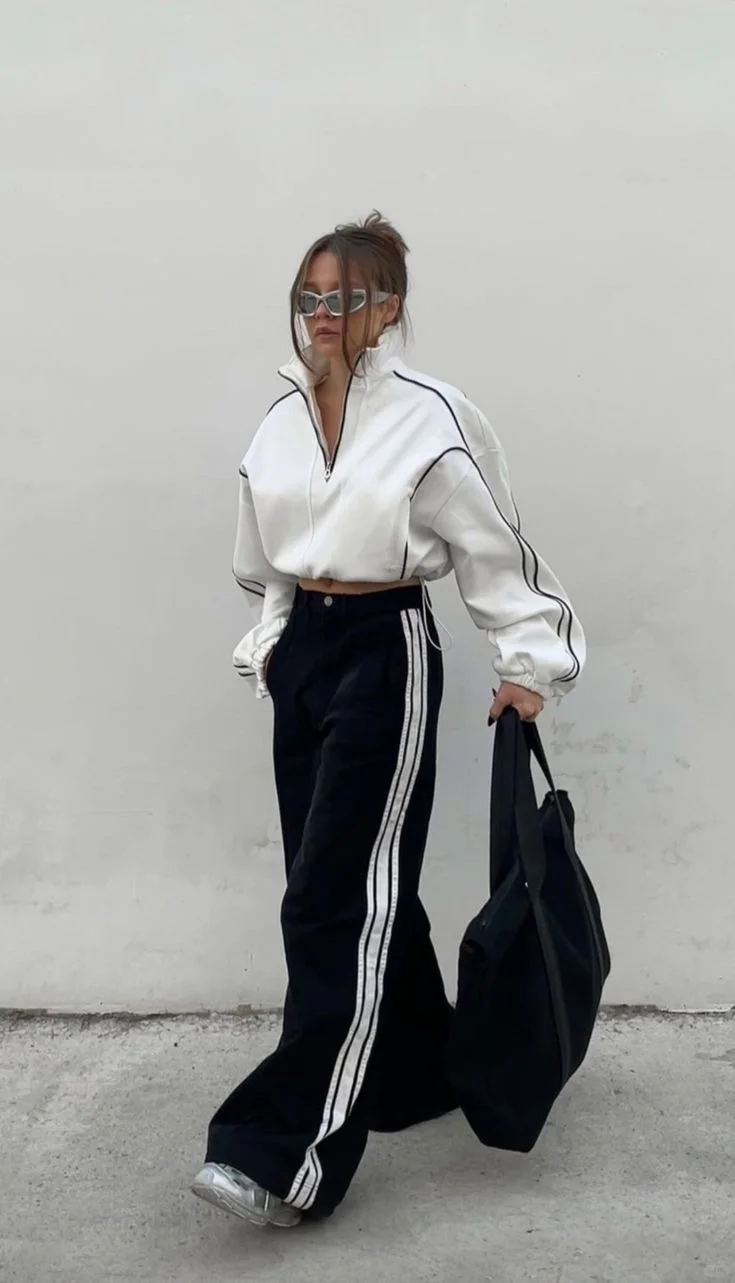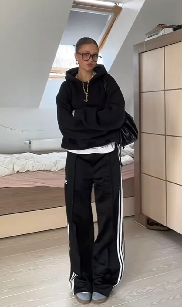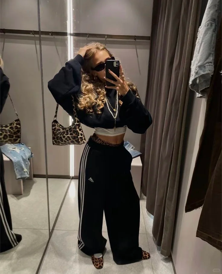 三条杠的藏蓝运动裤,搭配休闲感卫衣,让整个LOOK显得随性自在。