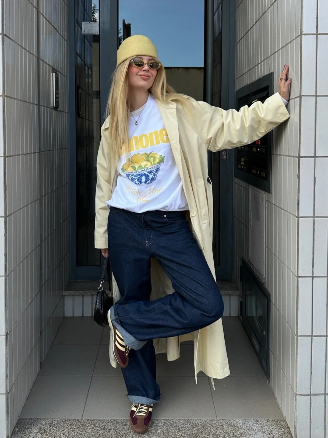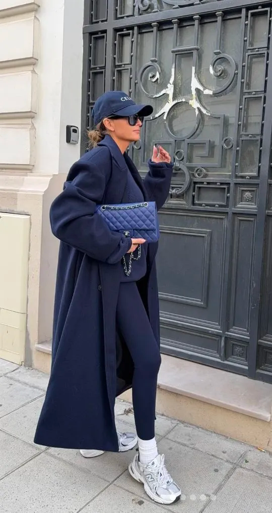 给藏蓝大衣配一条蓝色瑜伽裤,在正式与休闲、厚重与轻盈、经典与潮流之间,找到精妙的平衡点。