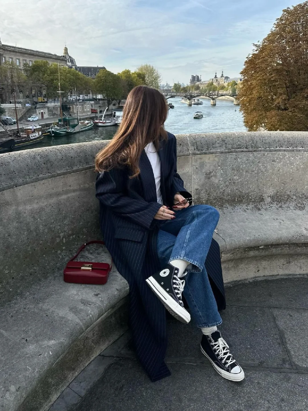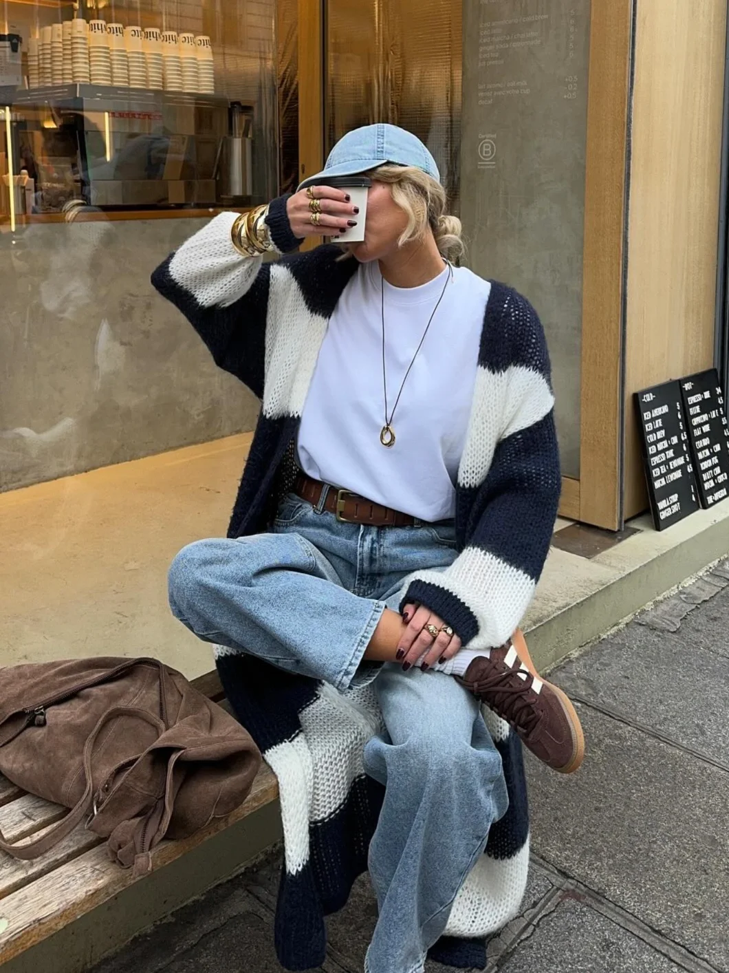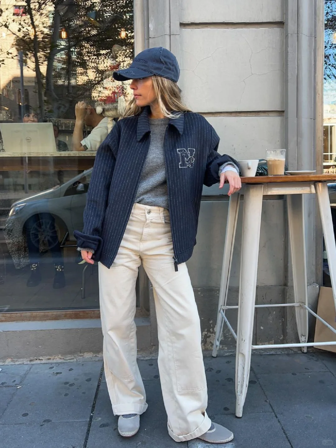 条纹,尤其是藏蓝色系条纹单品,它跨越季节与风格,以永恒的韵律感,为日常穿搭注入一丝恰到好处的都市活力,比如条纹夹克、条纹阔腿裤。