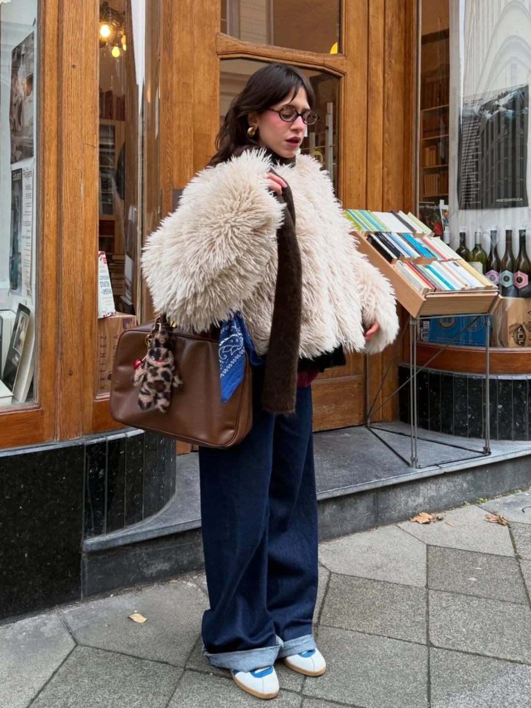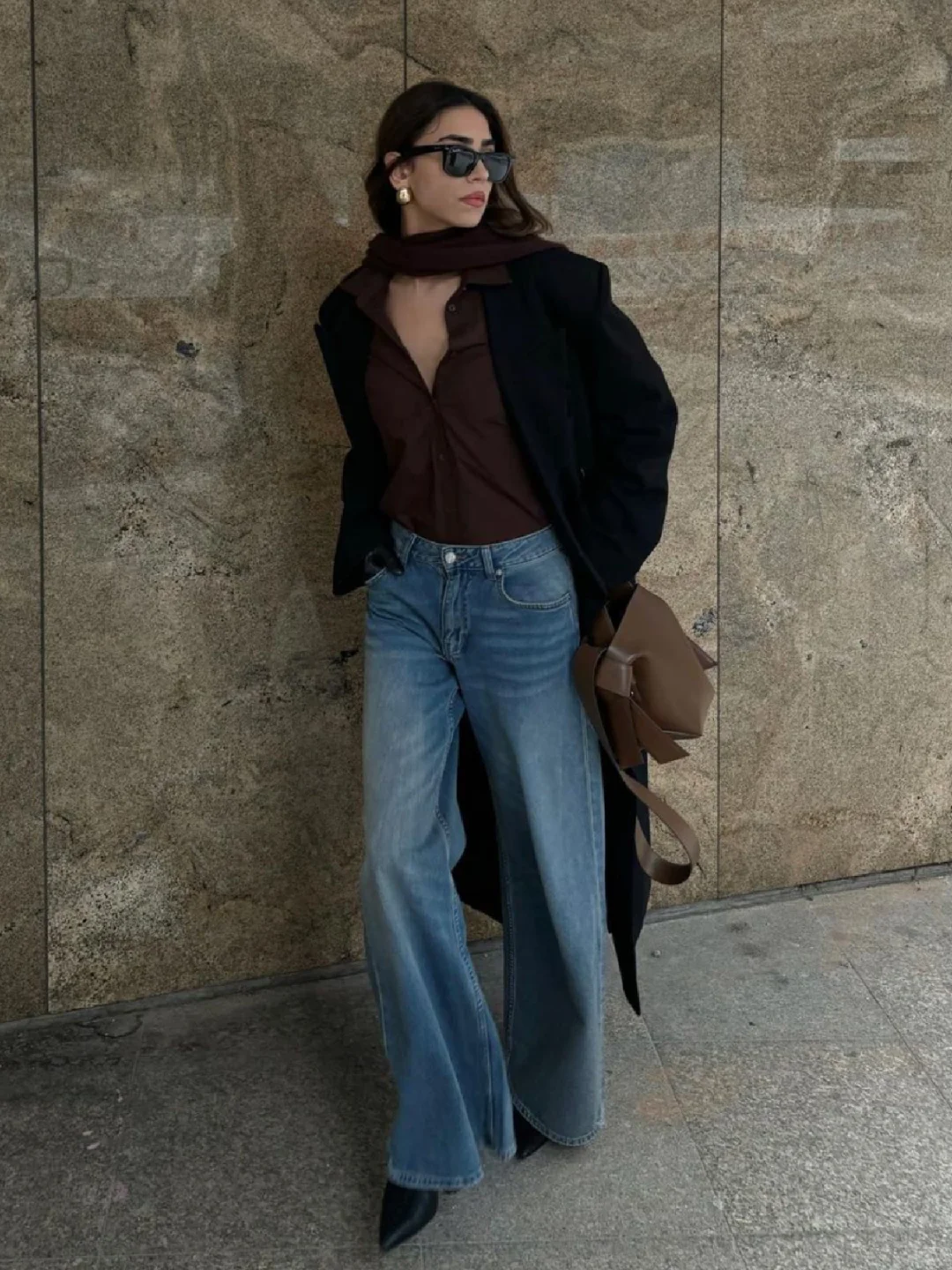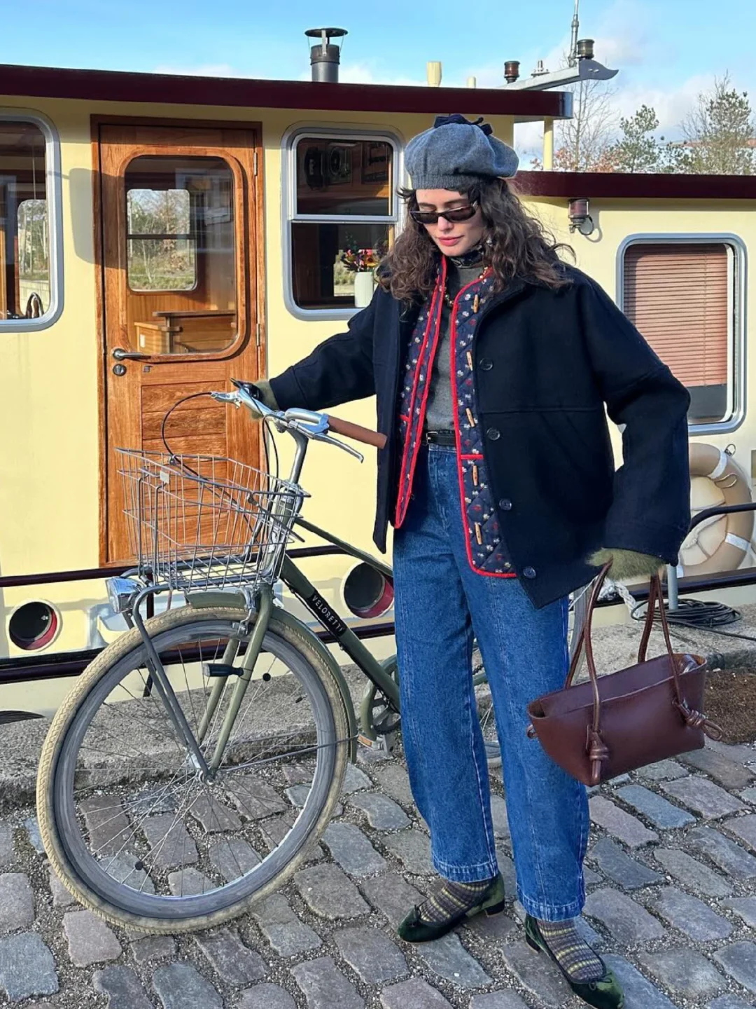 内搭如果选择大地色系的,可以拎一个棕色调的包包,和内搭呼应起来,与藏蓝大衣、牛仔裤形成反差。