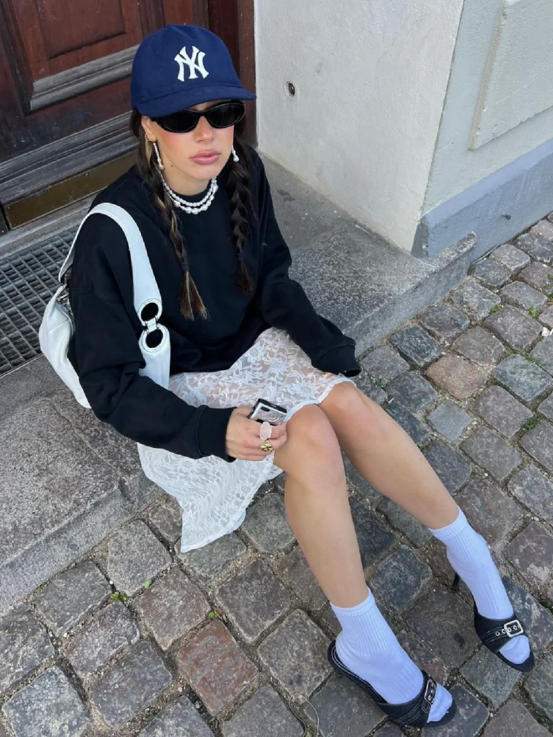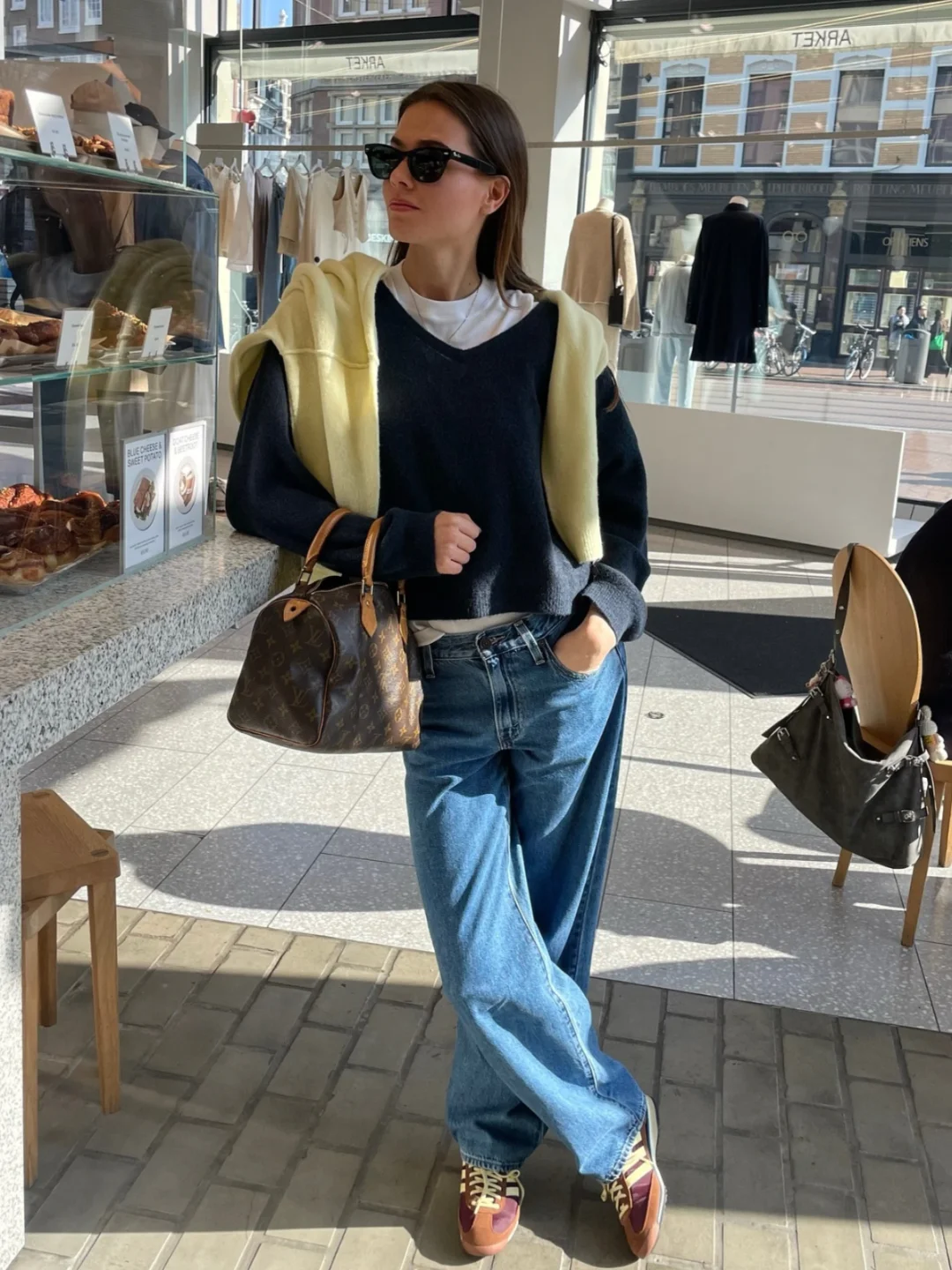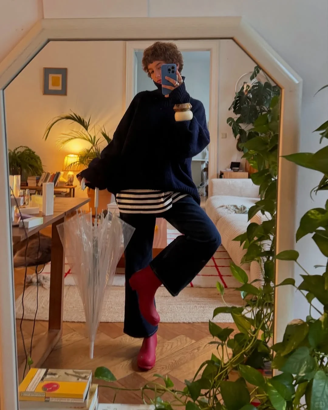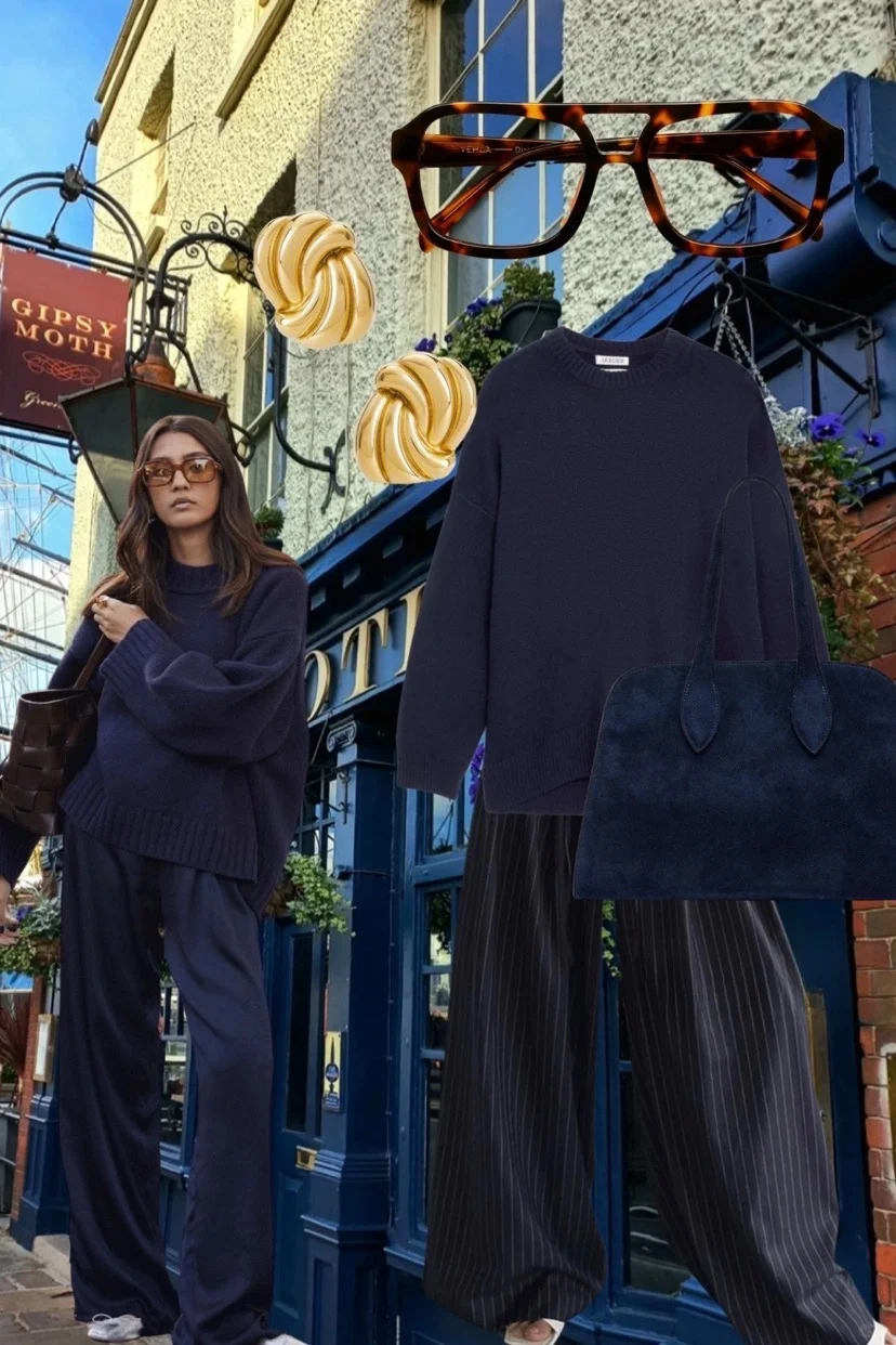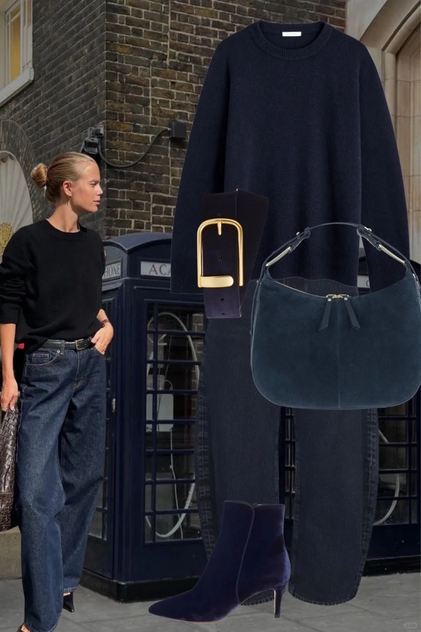 穿藏蓝色毛衣,也可以参考同色系配色法,配一条同色调的牛仔裤、半裙。那如何穿出“毫不费力”的层次感?关键在于制造差异。材质的厚重与挺括、光泽的哑光与微润,以及色度的微妙深浅变化,让整体造型既统一又充满呼吸感。