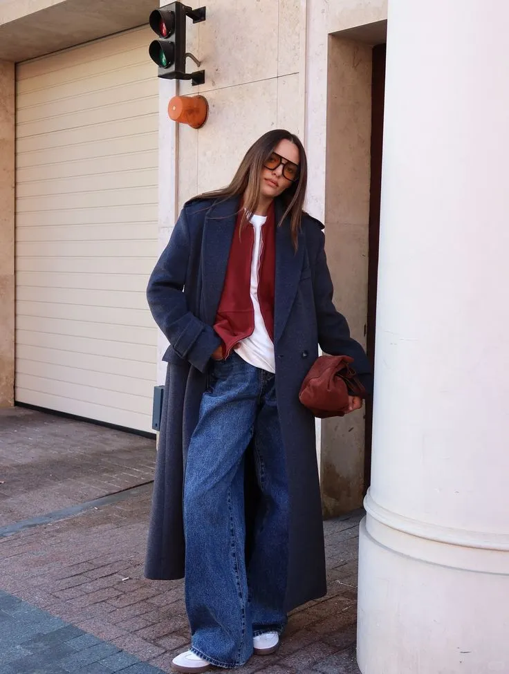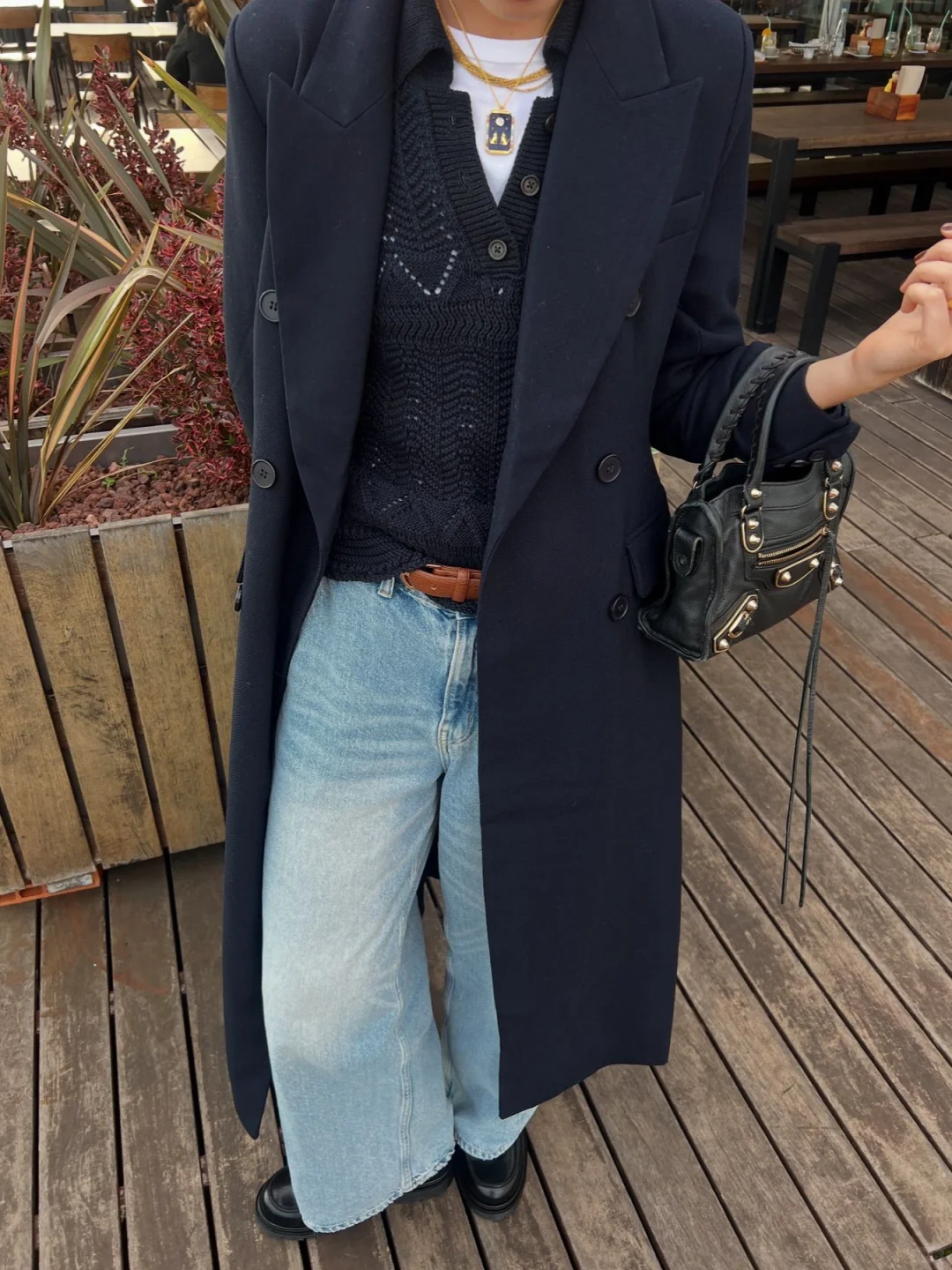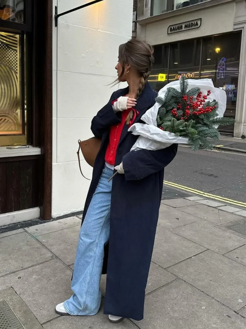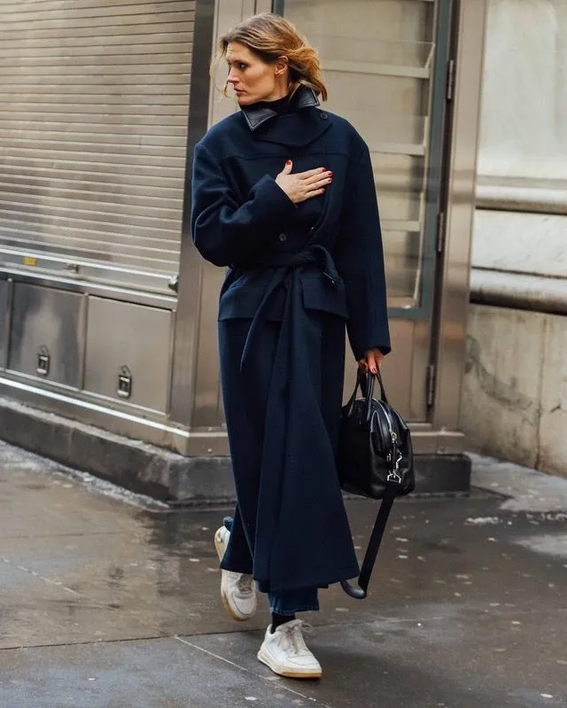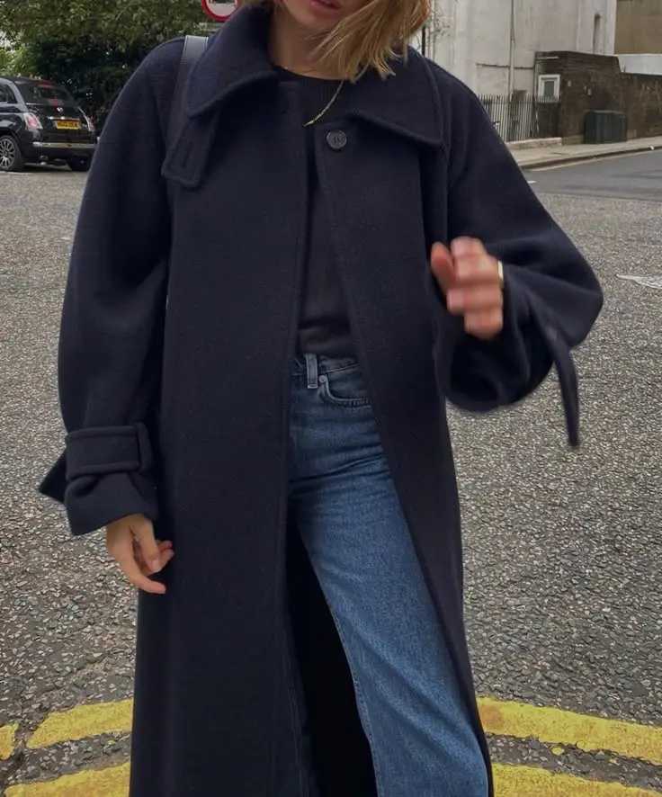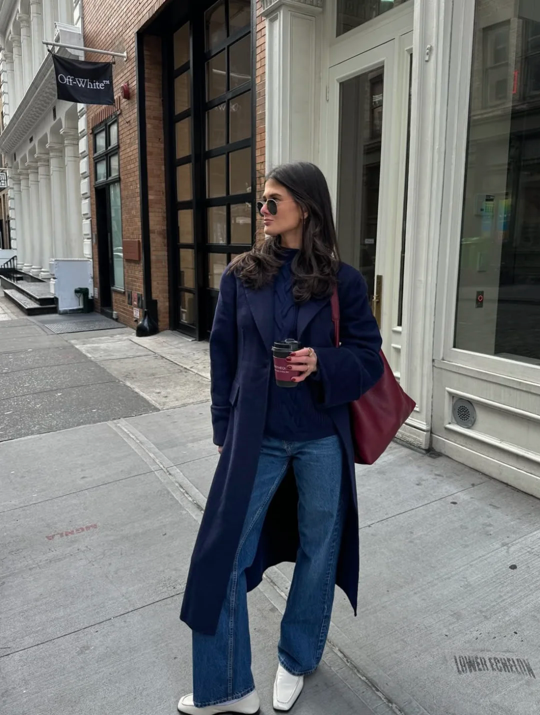藏蓝色大衣可以参考同色系搭配法,配一条蓝牛仔裤,浅蓝灰清爽一些,深蓝色的延伸感更强烈一些。拎一个暖色调包包撞色,比如棕色、红色、橘色。