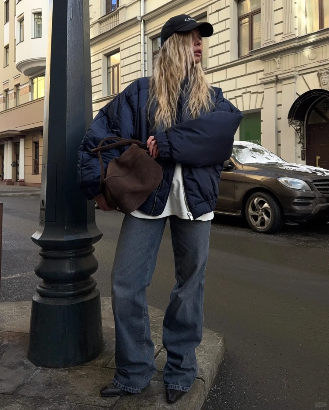 藏蓝色羽绒服内搭一件浅灰色羊绒衫+裙子,营造出冷静、知性且不失温暖的都市氛围。用纯白色单品作为内搭,是瞬间点亮造型的秘诀,下身配蓝牛仔裤,色彩过渡自然。