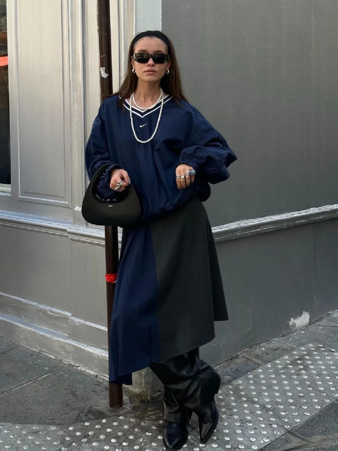 oversize藏蓝高领毛衣搭配黑色半裙,再踩双复古短靴,把整个人包裹住,随便往哪儿一站都是毫不费力的好看。同样的毛衣,配蓝色牛仔阔腿裤,又是另外一种感觉。