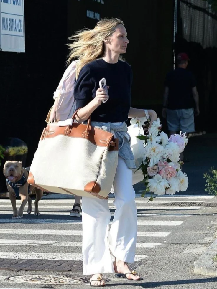 从毛衣到下装和谐统一,营造出高级而克制的整体感时,拎一个红色包包撞色,红因蓝的沉静而更显炽烈夺目,蓝因红的跳跃而更显深邃悠远。