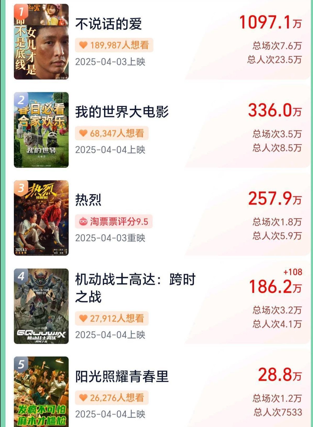 截至3月30日,今年16部清明档新片中,有8部已经开启预售,《不说话的爱》目前在预售票房已经破千万,遥遥领先。不知道这部张艺兴搭戏小朋友的电影,能不能和曾经的《人生大事》一样,成为口碑票房双赢的电影。