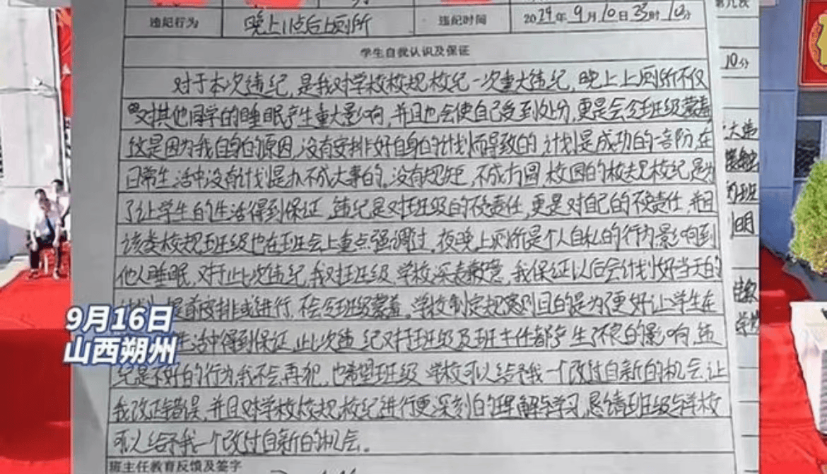 事件的处理方式也令人质疑。学生因上厕所而被严厉处分,且需要承担打印1000份“自我认识”的费用,这是否合理?虽然事后学校已退还了100元打印费,但这一惩罚手段和对学生自我反省内容的公开分发,是否会对学生心理造成过大的压力?事件中的这名学生,仅因夜间上厕所就被冠以“对班级蒙羞”“自私”的标签,这无疑是对学生自尊心的伤害。学校在强调纪律的同时,必须兼顾学生的情感和心理健康,避免使用可能造成二次伤害的惩罚方式。