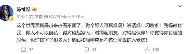 “这个世界我真是越来越看不懂了!做个好人可真难啊!说话难!闭嘴难!我妈教育我,做人不可以自私!得对得起家人,对得起朋友,对得起伙伴!你觉得你有理的时候,也许伤害了很多人!底线和原则应是不该让无辜的人受伤 !”
