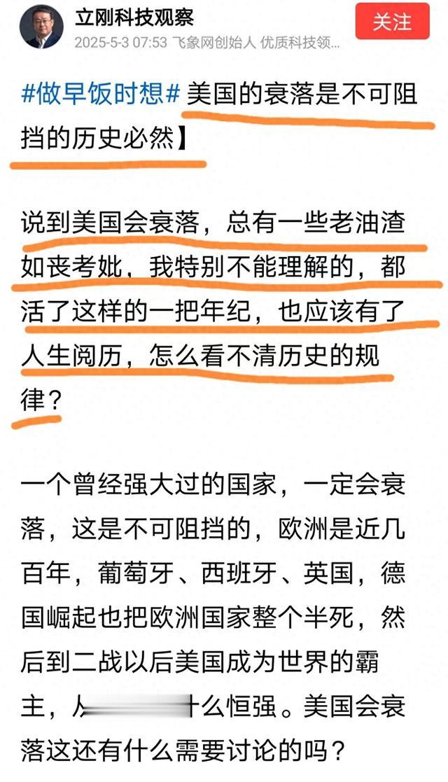 项立刚说,美国正在走向衰落,这是一个不争的事实,可中国一些老油渣们绝对不承认。