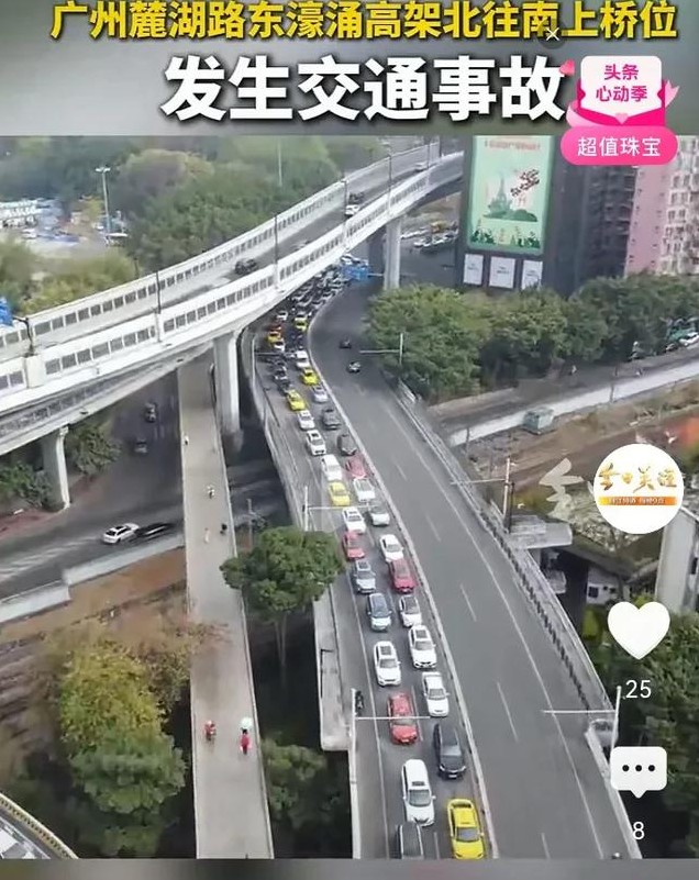 广东麓湖路东濠涌高桥由北向南上桥的地方突然发生了严重的交通事故,疑似有车子上桥的时候抢道发生了猛烈的碰撞,道路中间的护栏被撞断了十几米!