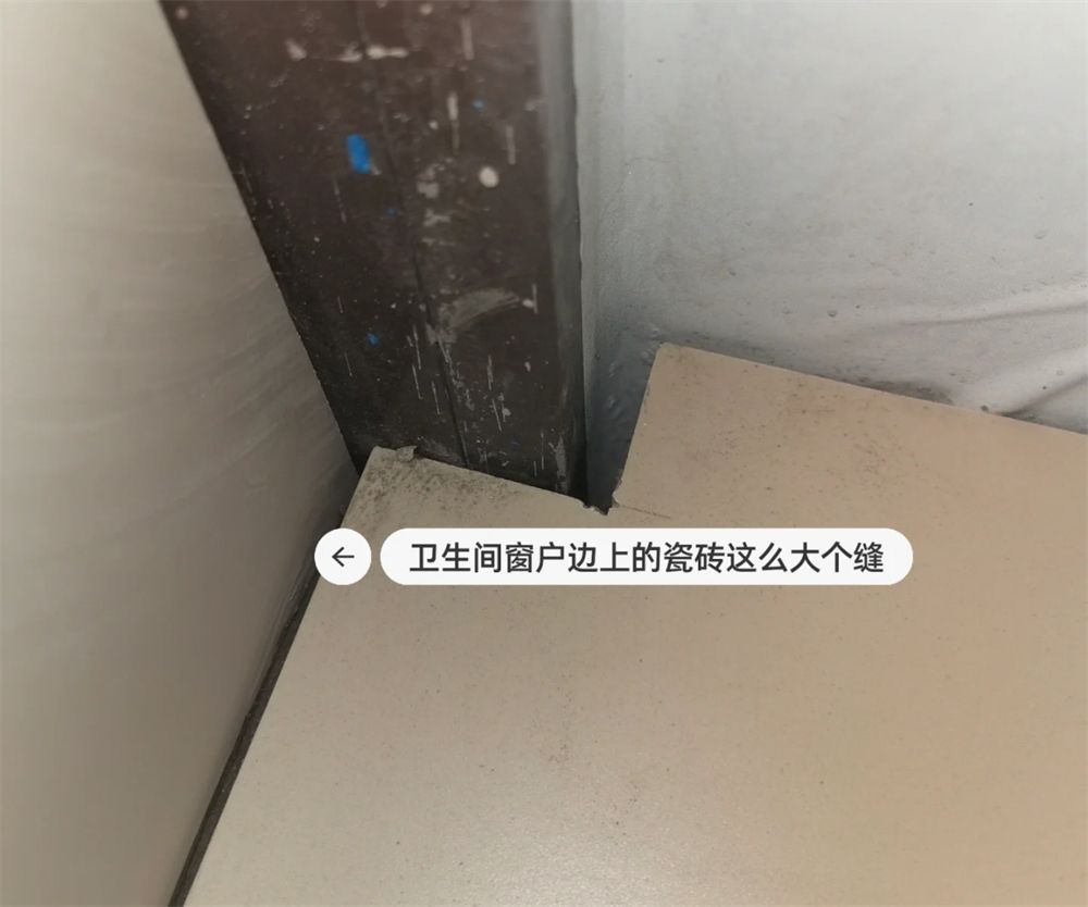 卫生间的窗户旁边,瓷砖缝隙留得非常大,甚至变成了一个藏污纳垢,积灰生虫的绝佳去处,如此大的缝隙,就连后面美缝修补都变得格外困难,我是真不知道该怎么形容我看见它时崩溃的心情了。