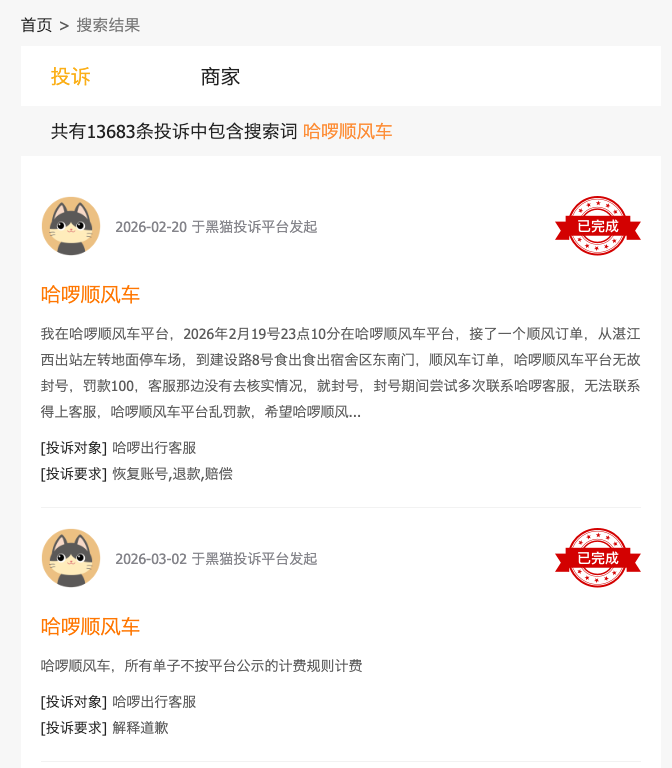 2026年3月10日,新浪科技旗下《5D调查》栏目报道称,多位乘客在春运期间使用哈啰顺风车,遭遇坐地起价、半路甩客、贵重物品遗失不还等问题。