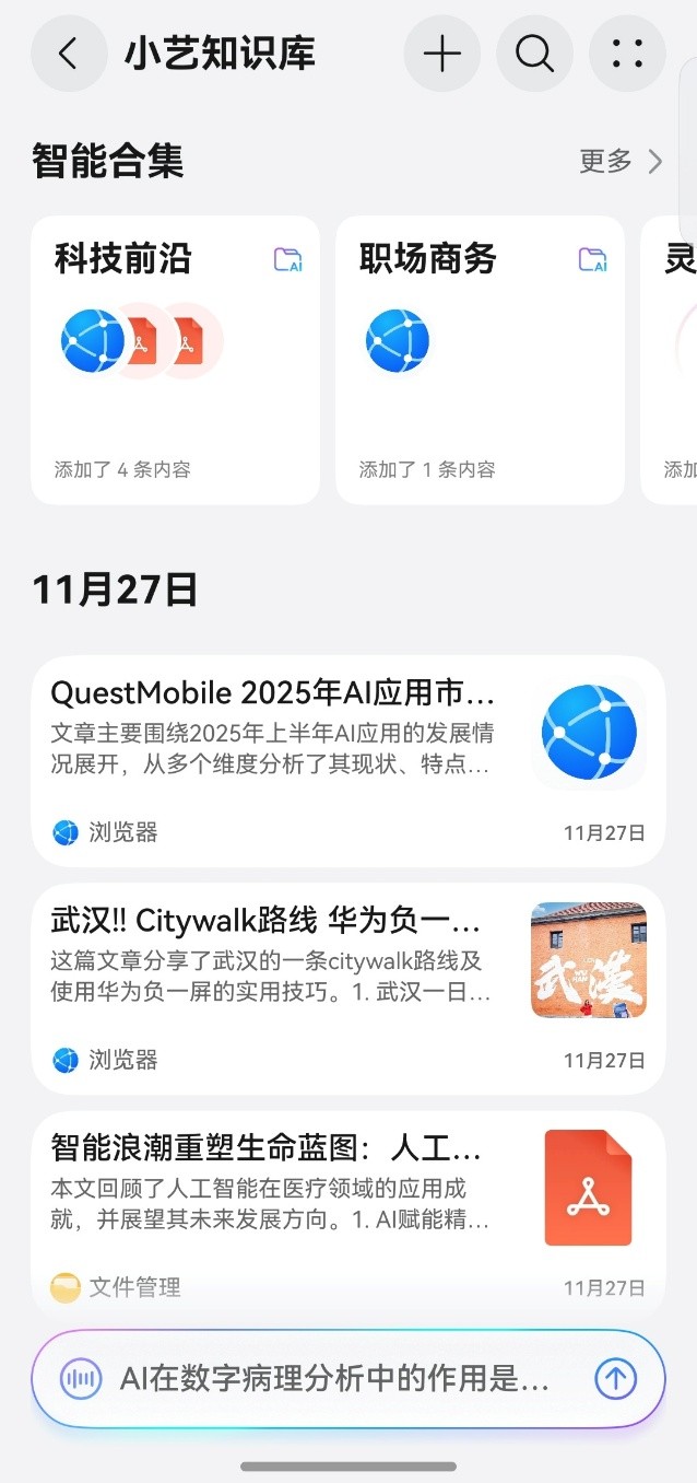 直到我把手机升级到了HarmonyOS 6,才真正发现了新大陆。原来我的华为手机,藏着位24小时待命的资料管理员和文档分析师——小艺知识库,直接把我的“数字粮仓”盘活了。