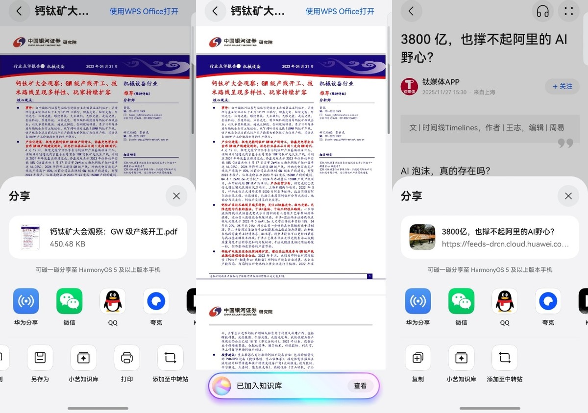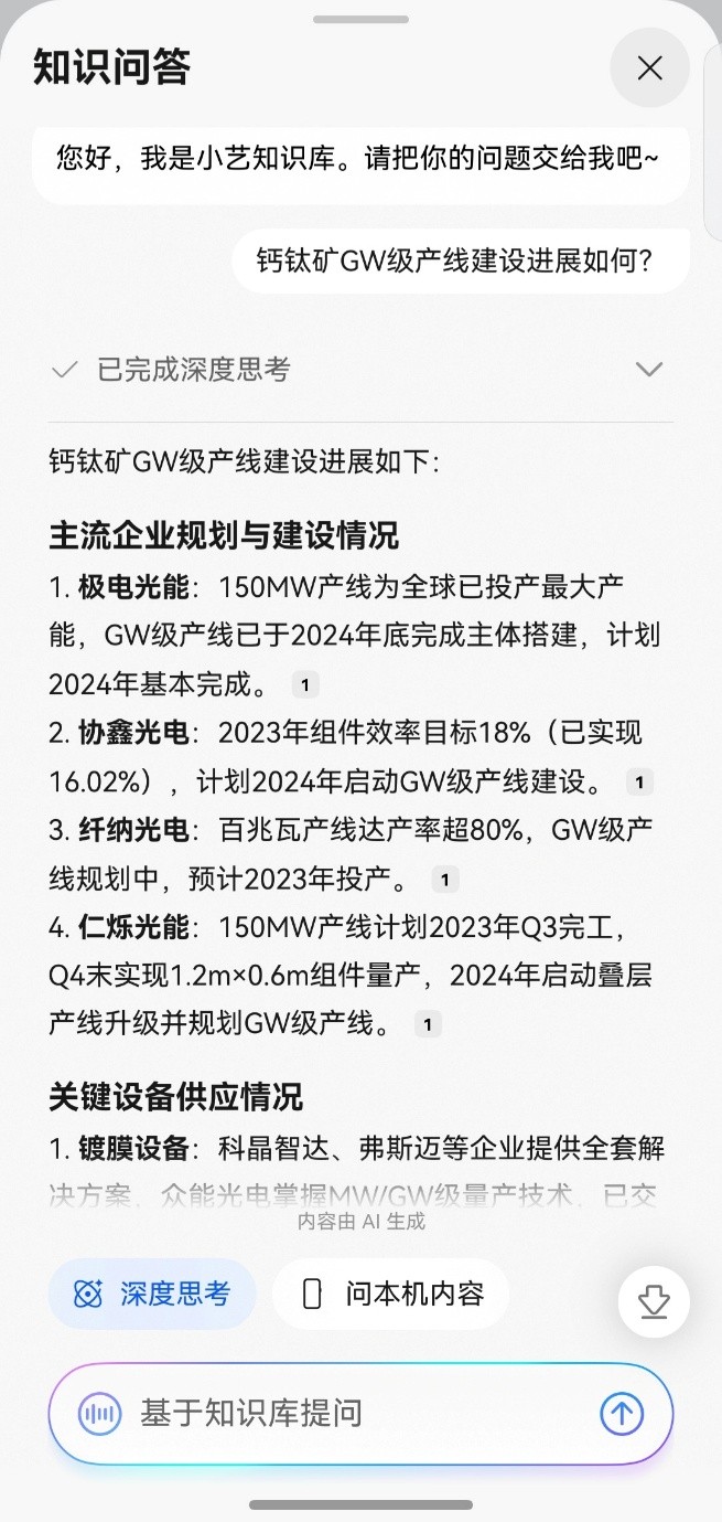 资料存进去不是目的,用起来才是王道。 以前写方案看行业研报的我:打开,翻两页,困了,先关上。上班两小时,进度五分钟。现在,我把要看的资料存进小艺知识库,直接问:“钙钛矿GW级产产险建设进展如何?” 很快就能收获一份带有数据来源的总结。
