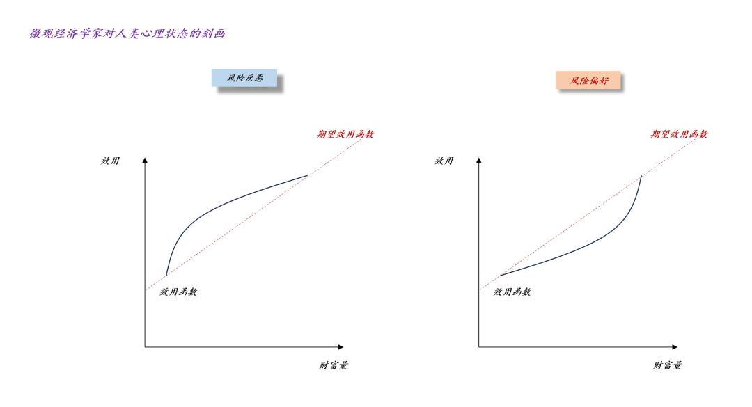 如上图所示,当人们的 财富效用函数 表现出 边际效用递减 规律时( ps:效用函数的二阶导数大于零 ),我们称人们是风险厌恶的;对称的,当人们的效用函数表现出 边际效用递增 规律时( ps:效用函数的二阶导数小于零 ),我们称人们是风险偏好的。