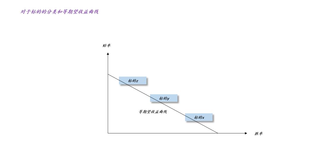 如上图所示,标的x、y、z的【胜率,赔率】均不相同,其中,x的胜率最大,z的赔率最大,y两方面均折中。但是,它们有一点共性——期望收益相等。