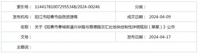 关于《阳春市春城街道兴华路与育德路交汇处地块控制性详细规划(草案)》公示