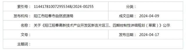 关于《阳江阳春高新技术产业开发区新吉片区三、四期控制性详细规划(草案)》公示