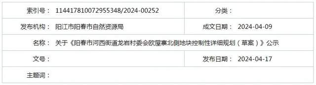 关于《阳春市河西街道龙岩村委会欧屋寨北侧地块控制性详细规划(草案)》公示