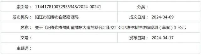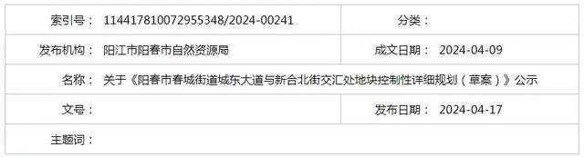 关于《阳春市春城街道城东大道与新合北街交汇处地块控制性详细规划(草案)》公示