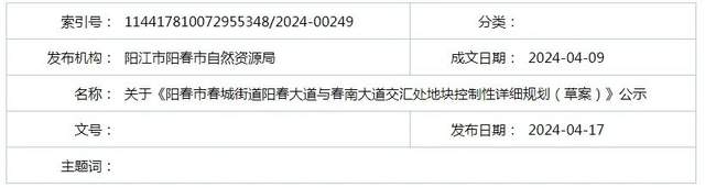 关于《阳春市春城街道阳春大道与春南大道交汇处地块控制性详细规划(草案)》公示