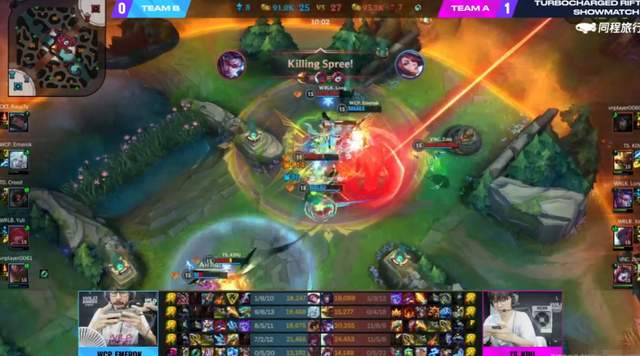 无限模式结束后,双方开启了急急峡谷模式。这局比赛,TEAM B选择了剑姬、佛耶戈、炸弹人、霞与石头人;TEAM A选择了阿狸、龙龟、薇恩、永恩与璐璐。