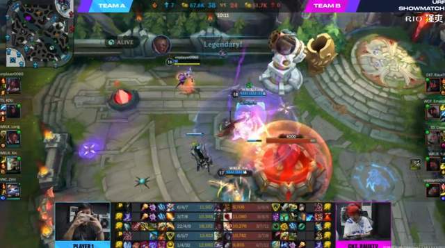 众所周知,无限火力团战固然重要,但更多的是看选手的个人操作。所以这场比赛短短2分钟就已经爆发了10个“人头”。特别是盲僧,表现非常亮眼。而操控阿卡丽的路人表现也同样精彩,操作非常行云流水。比赛来到中期,逐渐发育起来的卢锡安戴着悠米开始掌控比赛,期间更是打出了一波精彩的“五杀”。