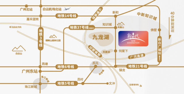 项目地理位置优越,紧邻地铁14号线和7号线换乘站——知识城站,步行约800米即可达地铁站。这意味着从项目出发,仅需15分钟即可快速抵达广州市中心,享受城市繁华。同时,多条地铁线路以及邻近的广河高速、花莞高速等多条路网,让湾区内的城际出行也极为便捷。项目预计2024年开通的白云机场至佛山轨道交通,更将极大缩短到达机场及珠三角城市的时间。