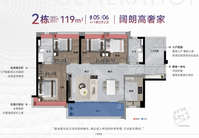 建面约119㎡四房两卫户型:作为项目的大面积舒适户型,119㎡的四房设计,拥有美景入户花园,将花香与家宅融为一体,营造温馨的居家氛围。客餐厅一体化设计,开放式布局,让宾客欢聚游刃有余。巨幕阳台,无界视野,尽揽清风阳光入室。私密主卧套房,配备270°飘窗及独立衣帽间,彰显了实用美学与尊贵品位。