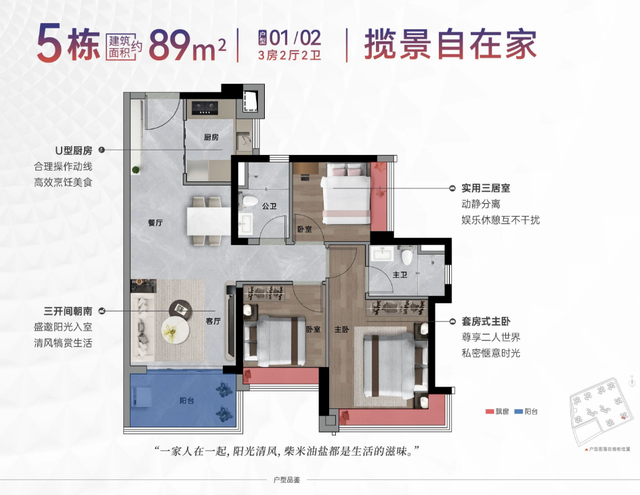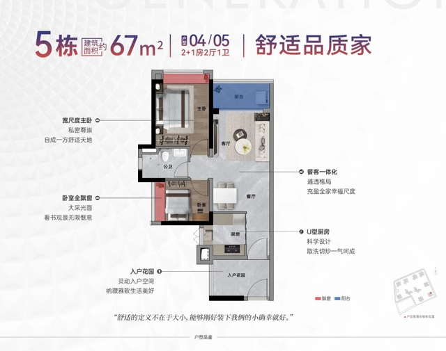 建面约67㎡两房两卫户型:这款户型精巧实用,入口处设置有“灵动入户空间”,方便日常收纳,也为居者打造了雅致的迎宾区。卧室与客厅均享有全景朝南设计,采光视野俱佳,将户外美景引入室内。一体化的客厅与餐厅设计,通透格局,能够充分满足全家人的活动和用餐需求。独立的玄关设计,增强了私密性,也便于自成一方舒适天地。U型厨房设计,科学合理,动线流畅,让烹饪过程更显轻松。