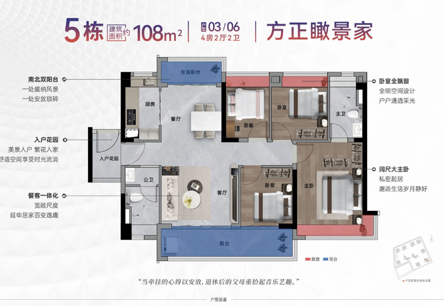 建面约108㎡四房两卫户型:这款户型为南北双阳台设计,不仅能欣赏到窗外的盆景风光,更能实现一处安放闲愁。客餐厅一体化设计,宽敞尺度,延展居家生活美学。主卧套房,全明空间,户户通透采光。阔尺大主卧,兼顾私密性,让生活增添宁静与诗意。